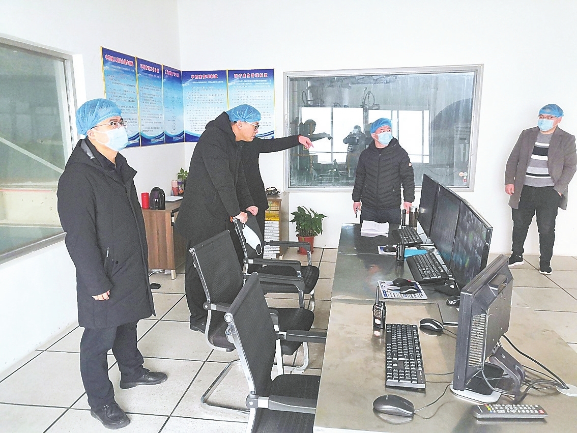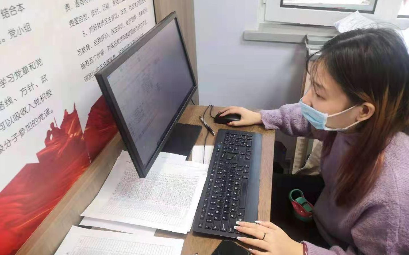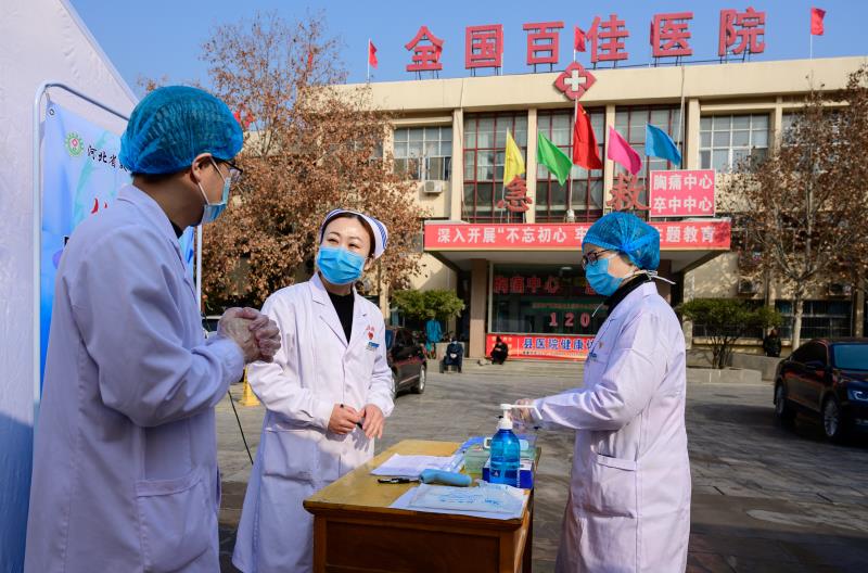 李雪(中)在医院预检分诊处查看体温登记情况