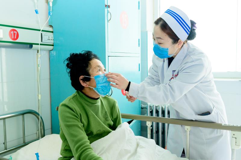 李雪在中医科病房教授患者正确佩带口罩。