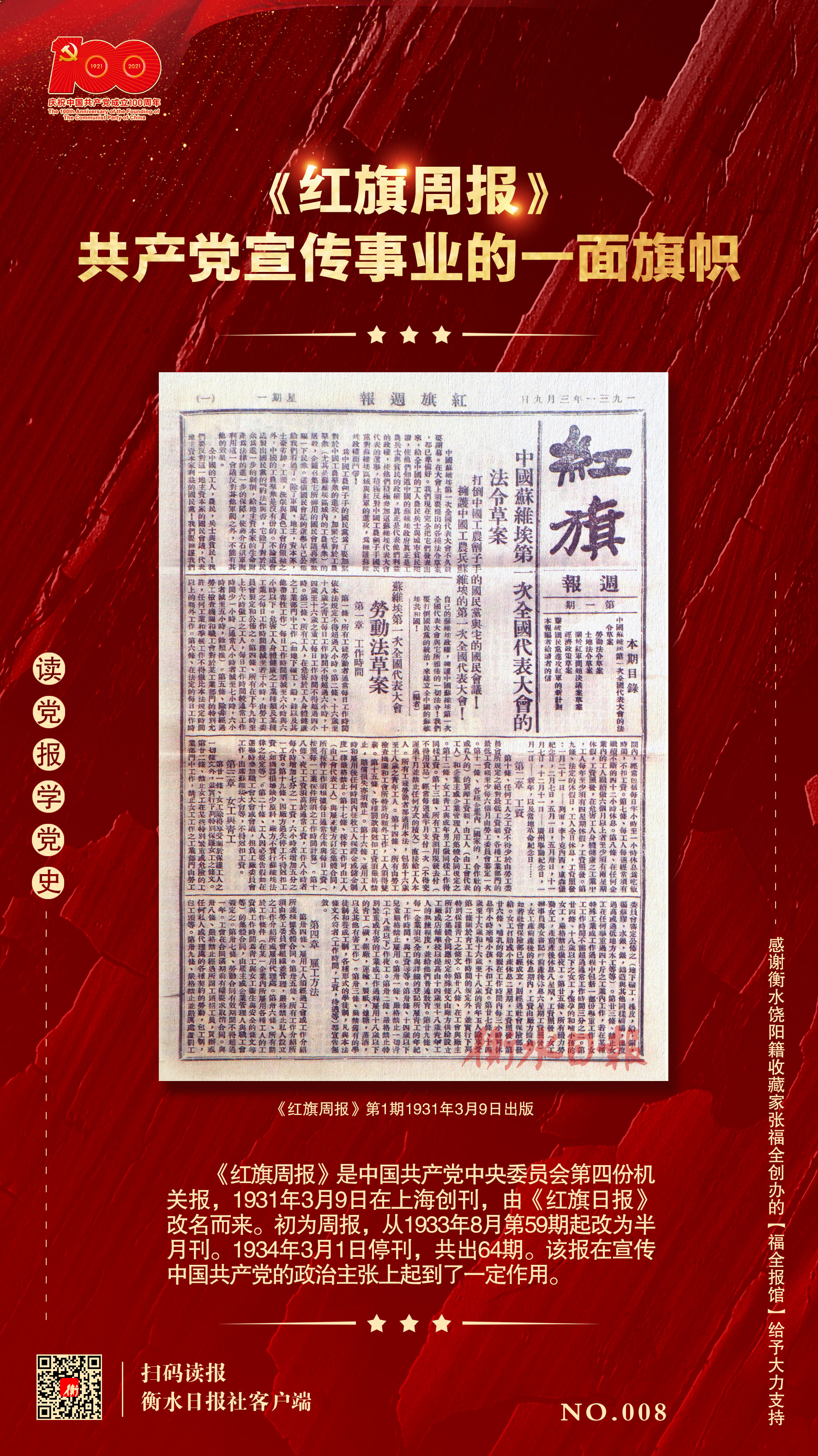 《红旗周报》是土地革命战争时期中国共产党中央委员会的机关报,1931年3月9日在上海创刊。《红旗周报》是由《红旗日报》改名而来,并由“中国共产党中央和江苏省委机关报”恢复为“中共中央机关报”。《红旗周报》在创刊号上发表了《中国苏维埃第一次全国代表大会的法令草案》《击破国民党进攻红军的新计划》和《本报编者给读者的信》。《红旗周报》1933年8月第59期开始改为半月刊,1934年3月1日终刊。《红旗周报》第1-9期,为8开版;从第10期开始,《红旗周报》改为32开版。在反动派白色恐怖的严酷环境下,《红旗周报》不能公开出版发行。为了掩护其真实面目,封面常以“实业周报”“佛学研究”等假封面出现。