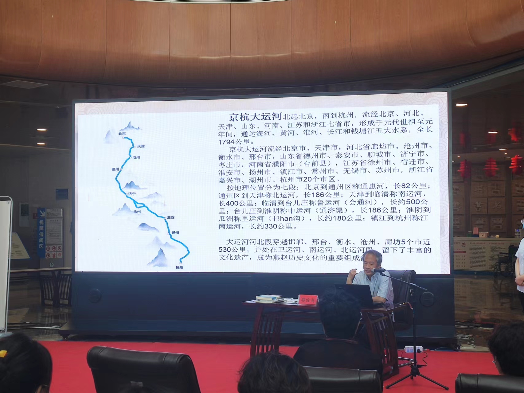 在随后举行的《千里大运河 清水荡碧波——加快推进大运河河北段通水复航》讲座中,衡水运河文化研究学者郭俊禹围绕大运河经过多水源生态补水,实现百年来全线通水这一盛举,全面讲解了大运河通水复航的重要性、可行性。使广大听众更加深刻理解大运河是中国历史上最伟大的水利工程,是历史的河、运输的河、科技的河、文化的河,更是生态的河。