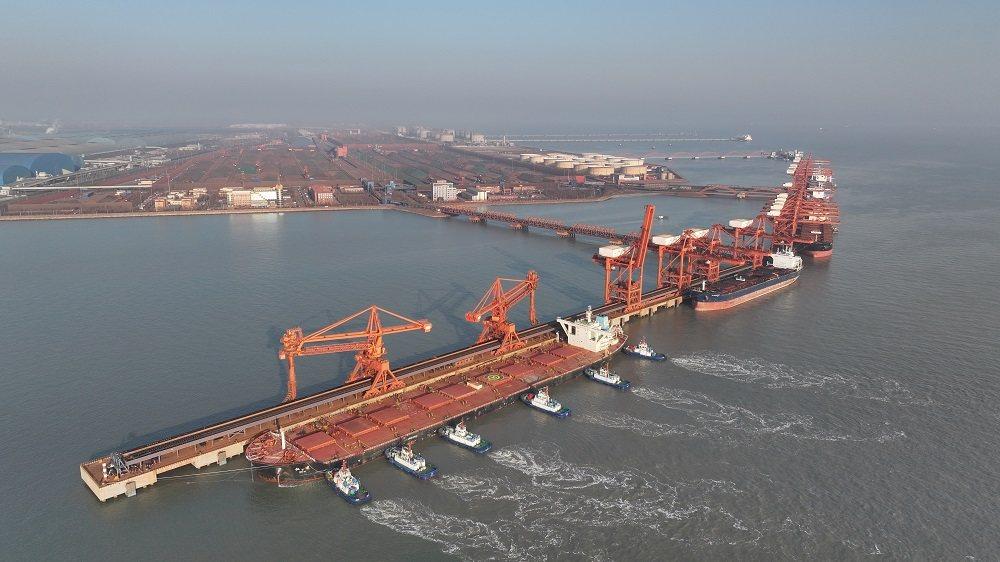 1月12日,一艘轮船在拖轮的协助下向唐山港曹妃甸港区矿石码头靠泊(无人机照片)。新华社记者 杨世尧 摄