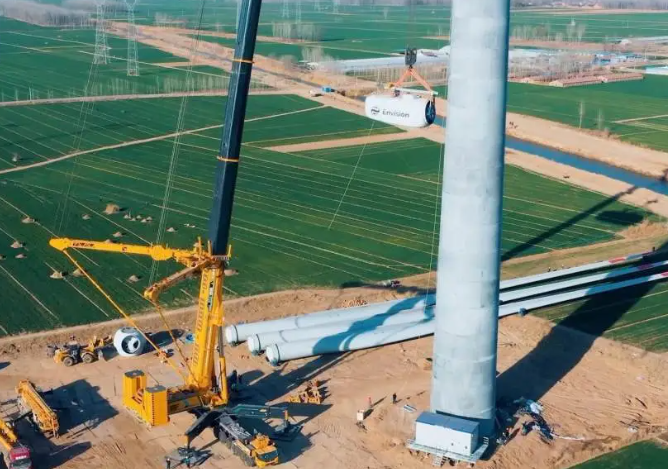 3月22日,我国自主研制的全球最大、吊装能力最强,全球首款11桥轮式起重机,在河北衡水将单机容量6.25MW的风机顺利吊装到位,完成首吊。本次吊装需要将120吨的风力发电机组机舱,以及长95米、重28吨的扇叶吊至160米的高空,相当于50多层楼高。