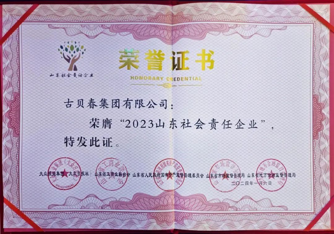 本次活动汇聚了山东省内超400家企业参与评选。经资格审查、材料赋分、网络投票、专家评审及终审会评议等程序,古贝春集团以卓越表现脱颖而出,成为84家获此殊荣的企业之一。值得一提的是,古贝春集团也是山东省白酒行业中唯一获此殊荣的企业,彰显了古贝春在行业内的卓越地位和社会责任担当,为行业树立了良好的榜样。此荣誉既是对古贝春过去的认可,也是对企业未来的期待与激励。