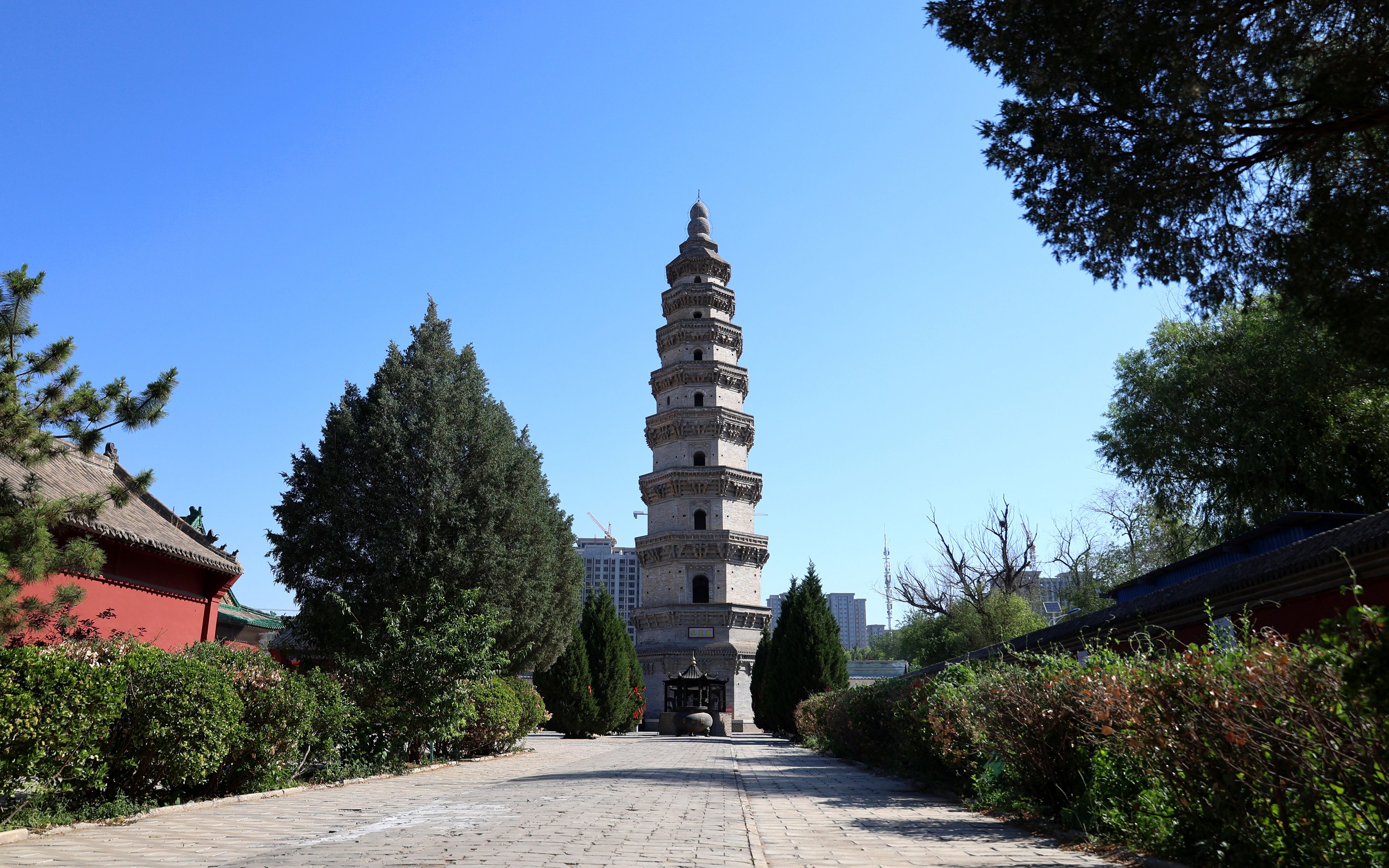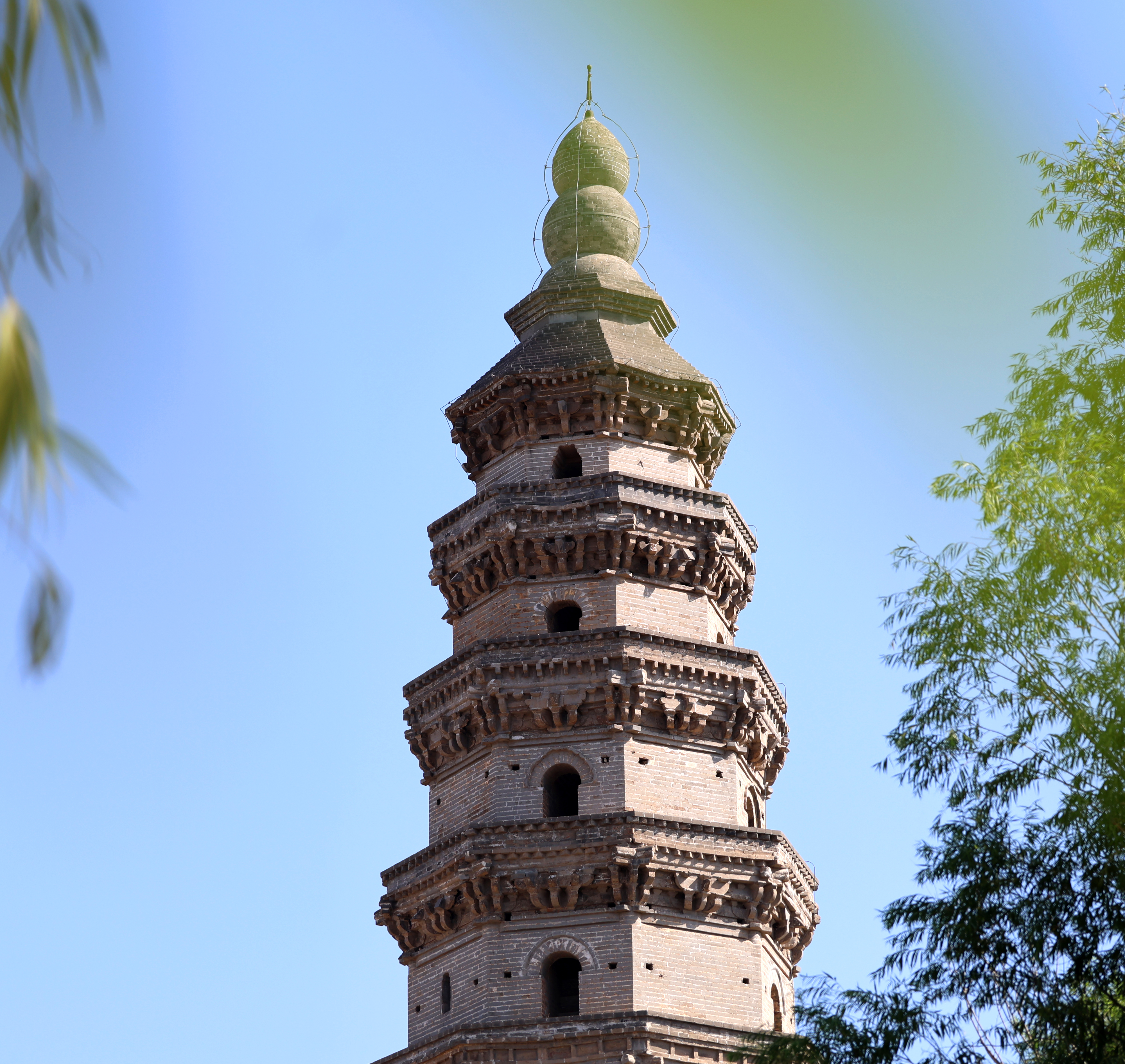 在桃城区文物所所长翟晓娜的引领下,记者进入宝云寺,沿着两侧种有冬青和松柏的青砖小路,来到寺内东侧,宝云塔全貌尽收眼底。这座原名擎天塔的楼阁式砖塔,呈八面棱锥体,共9层,高32.64米,塔基周长28.8米。因古塔在宝云寺院内,后来也沿用了寺的名字叫宝云塔。关于其始建年代,《衡水县志》有隋朝大业二年和唐代建造两种记载,但均无碑志可证。1980年,中国科学院自然科学史研究所的张驭寰教授对宝云塔进行了实地考察,鉴定为北宋初期所建。