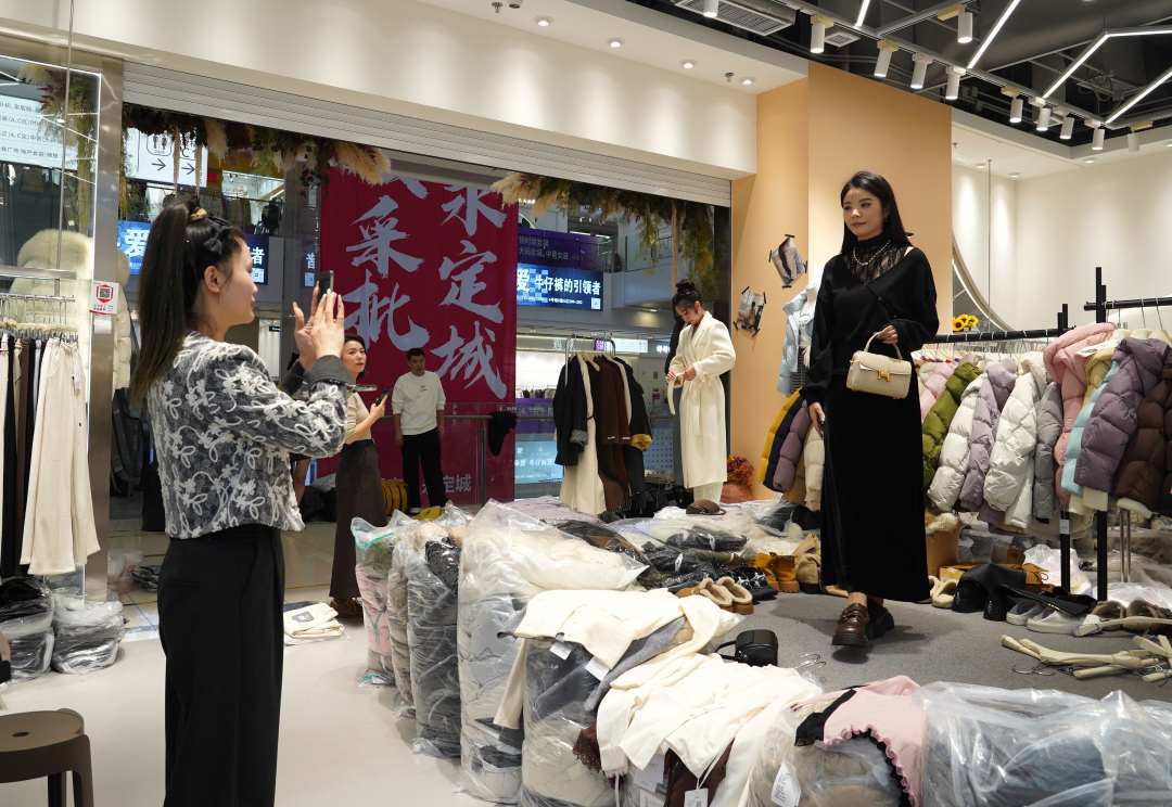商户为顾客线上展示服装穿搭效果。吴迪摄