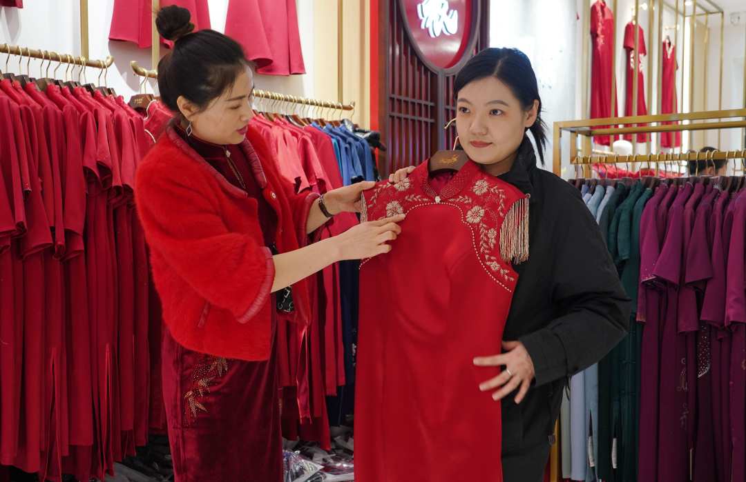 在京羽裳服装店内,一件件漂亮的旗袍挂满衣架,令人目不暇接,负责人谢晓秋边整理刚到的新款,边忙着回复手机里的订单消息,两位店员忙着接待顾客。