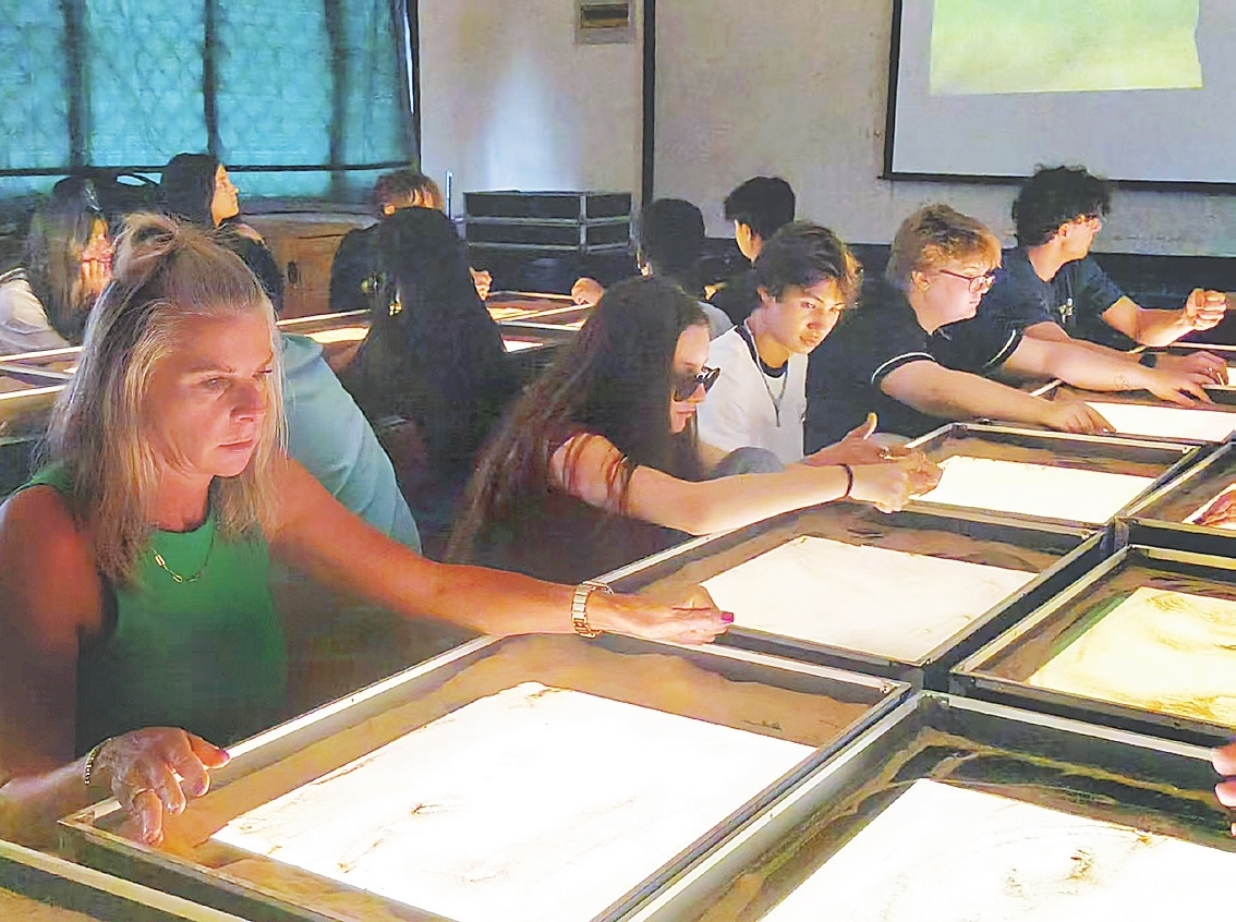 美国交流团成员在孙敬学堂体验沙画艺术。张凯 摄