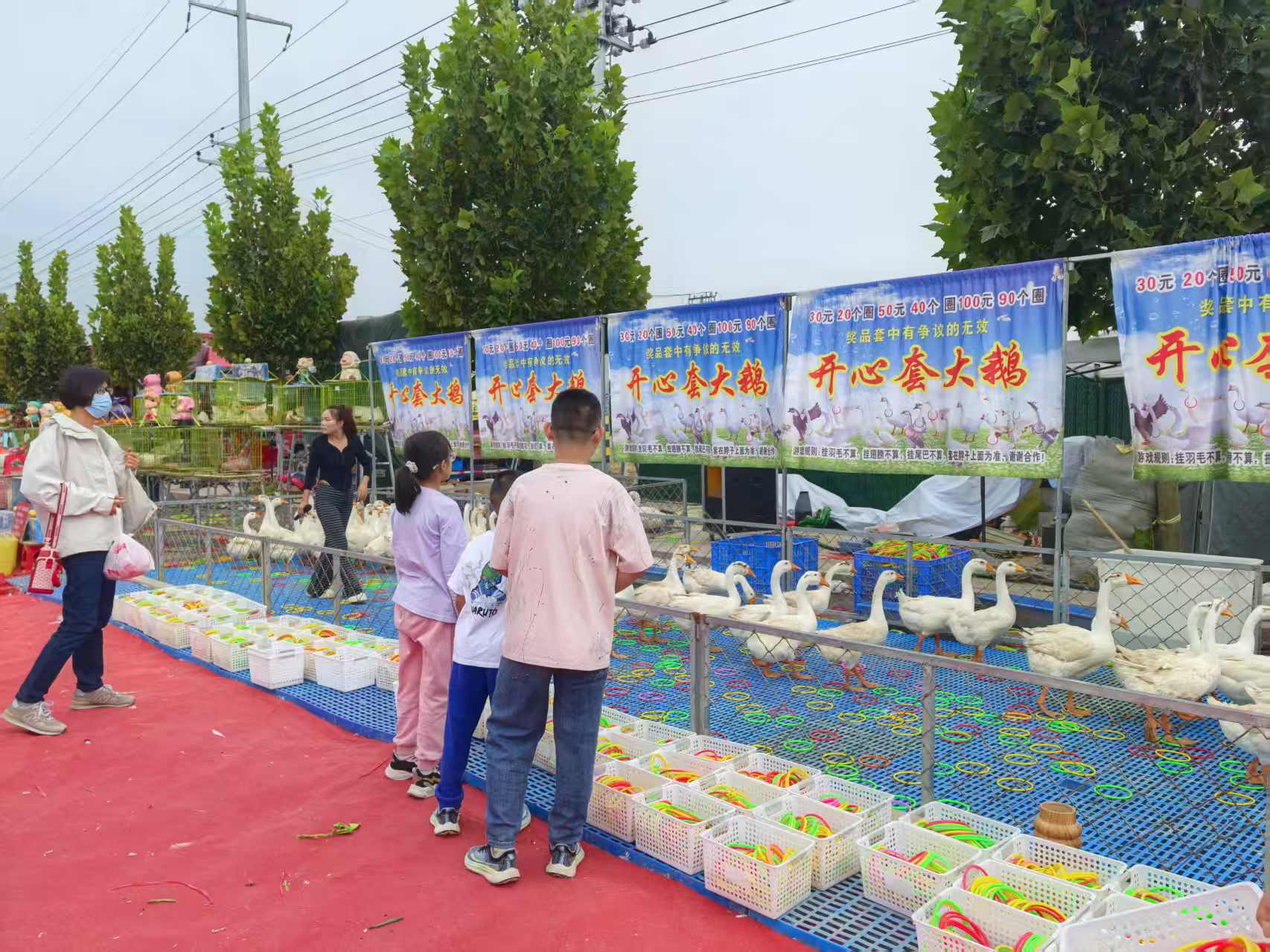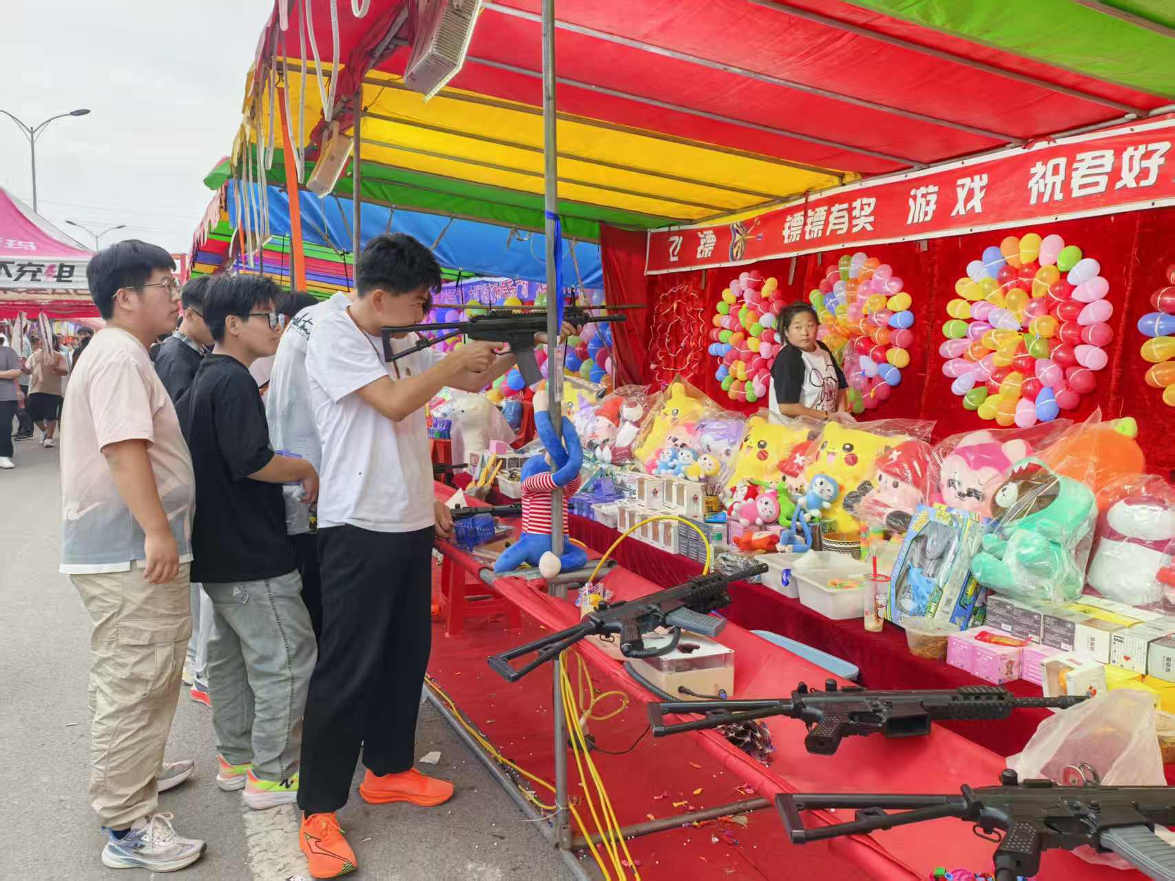 下午7时,走进庙会现场,热闹景象扑面而来。游戏区里,套大鹅摊位前排着长队,大白鹅在围栏里昂首踱步,游客们眼疾手快抛出彩圈,吆喝声、叫好声和鹅群的扑棱声交织成独特的“欢乐乐章”。不远处的打枪摊位前,青年端着仿真玩具枪瞄准气球阵,“砰砰”气枪声中,皮卡丘、大熊玩偶接连被赢走,同伴们举着手机记录,快门声与笑声不断。