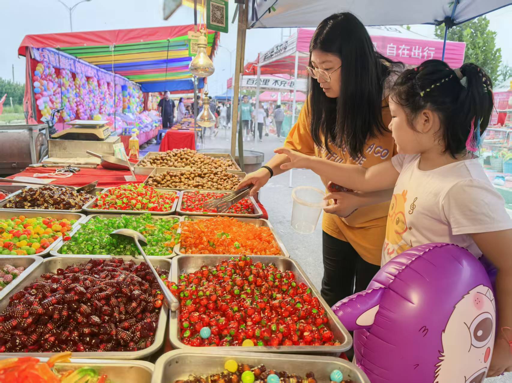烟火气十足的美食区更是令人垂涎。烤面筋在铁板上滋滋冒油,撒上孜然辣椒,香气四溢;烤鱿鱼在摊主手中翻卷,拍上两颗大蒜,鲜辣直击味蕾;桂花糕蒸得软糯,咬一口满是桂花香;糖炒油栗和彩色软糖排列在一起,串起孩童香甜的快乐记忆……来自衡水的周毅拎着刚买的油栗,袋子还透着温热,身旁的女儿则拽着妈妈走向烤串摊位。“假期就快结束了,特意带家人回老家赶大集,一会儿再逛逛书摊,下午就回家休整,准备上班。”周毅笑着说。