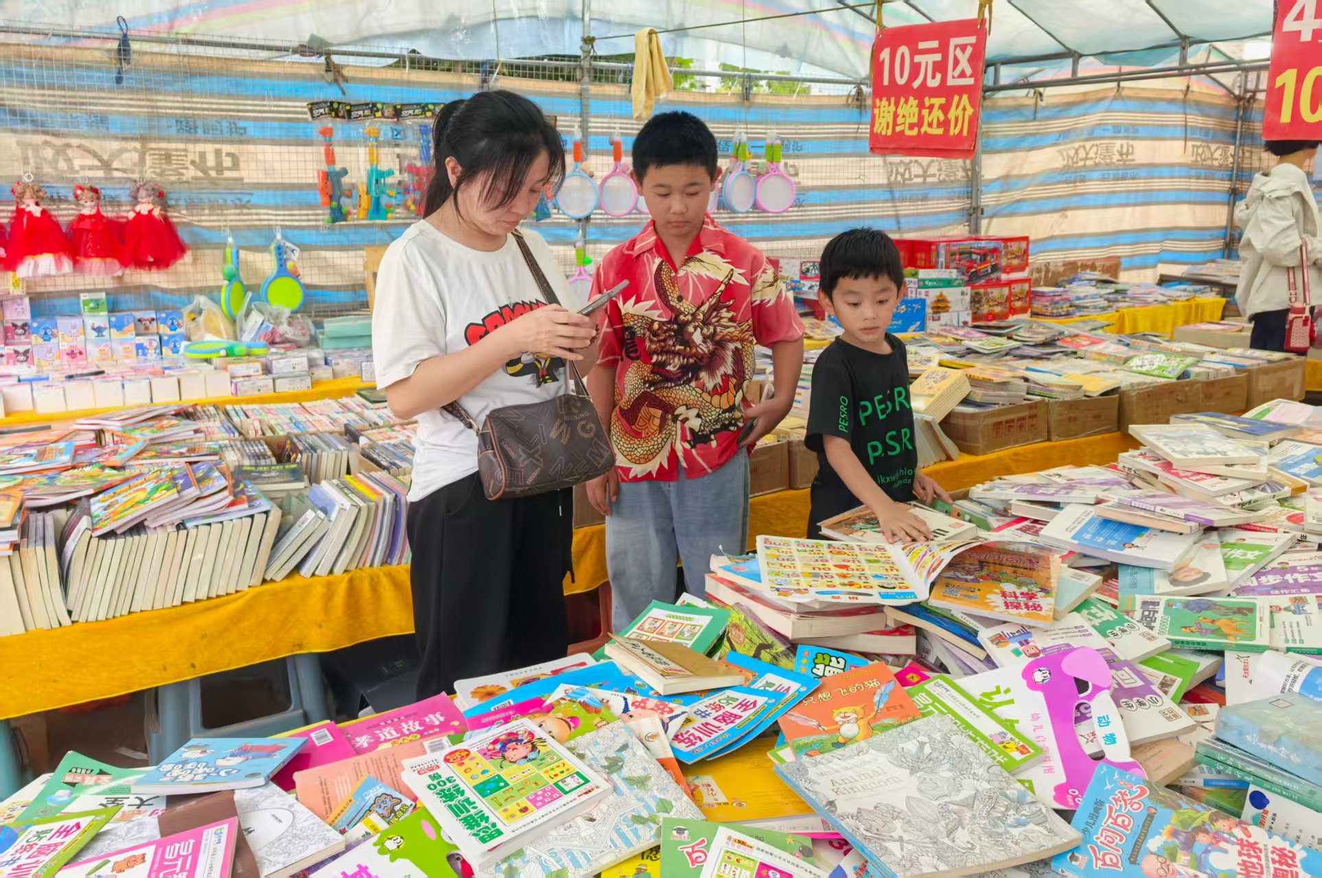 与游戏区、美食区的喧闹不同,书摊是庙会里的安静角落。家长带着孩子在儿童绘本、科普读物堆里“淘宝”,《思维训练》《科学探秘》等书籍十分抢手;学生们在科幻小说、历史典籍前停留,甚至抱着《三体》《明朝那些事儿》等书籍读了起来,在热闹中寻得一份文化惬意。北京游客高阳抱着一套余华的书籍说:“没想到庙会上的书种类这么丰富,假期不去热门景区‘人挤人’,来这儿放松身心也挺好的。”