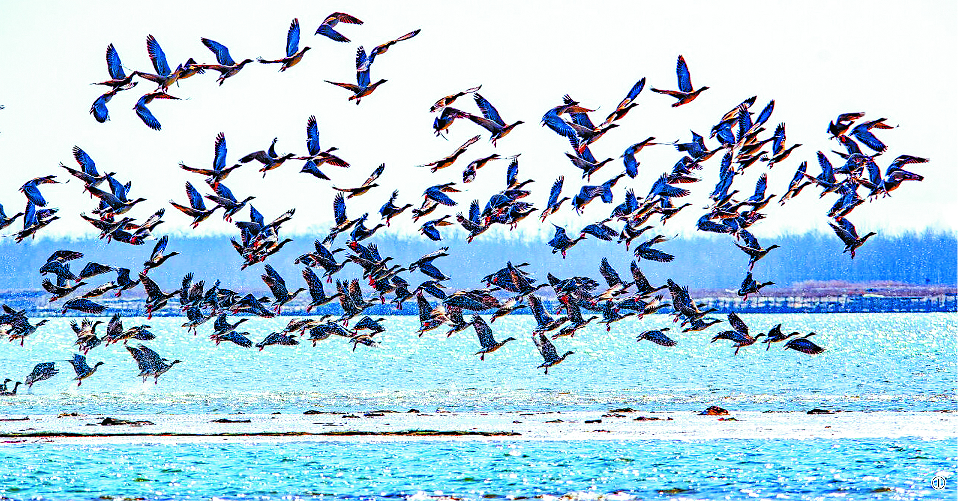 七里海潟湖湖面上群鸟飞舞。(摄于2025年10月12日) 费明健摄