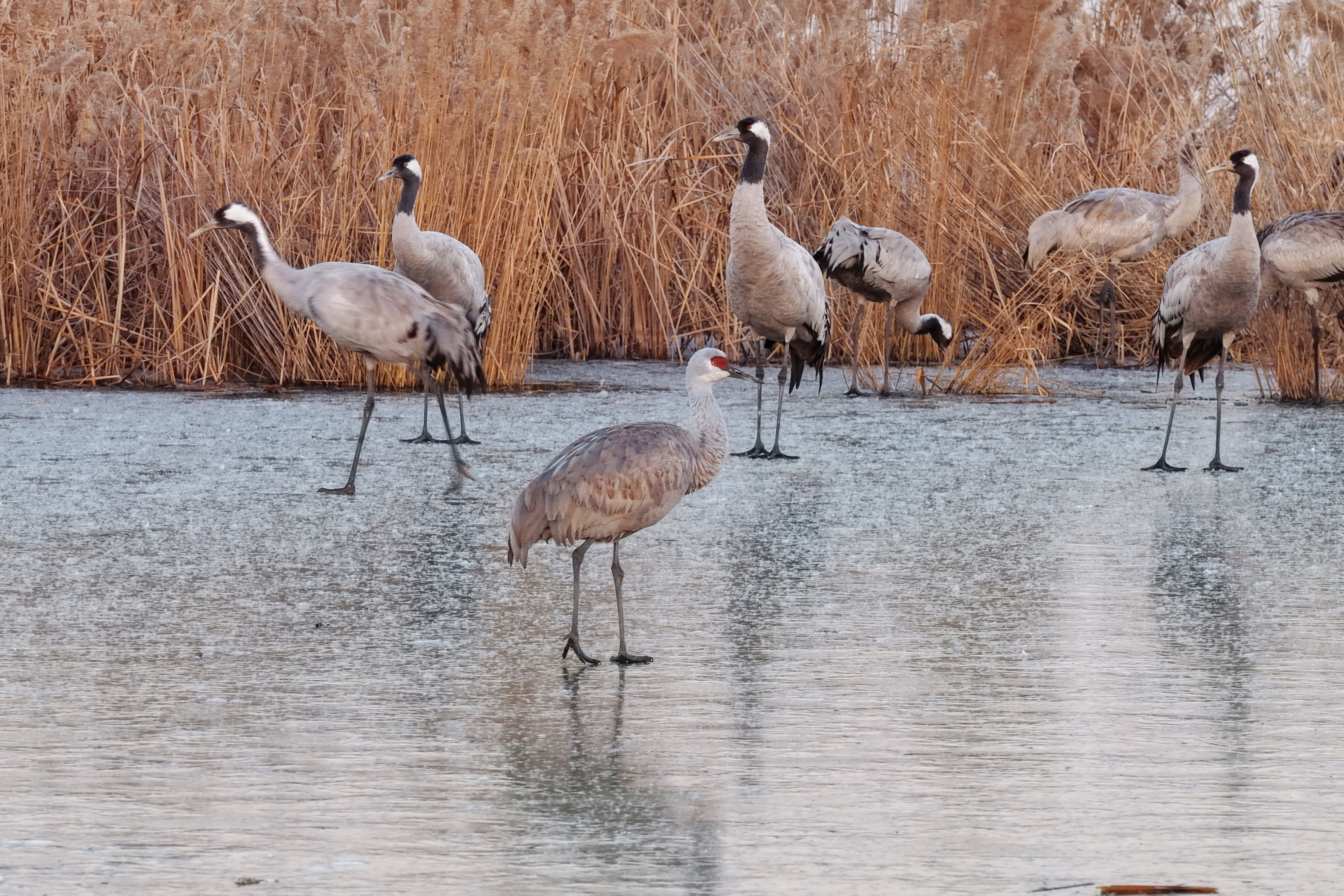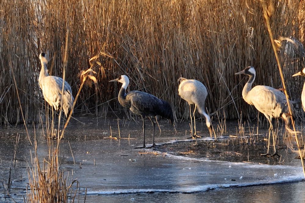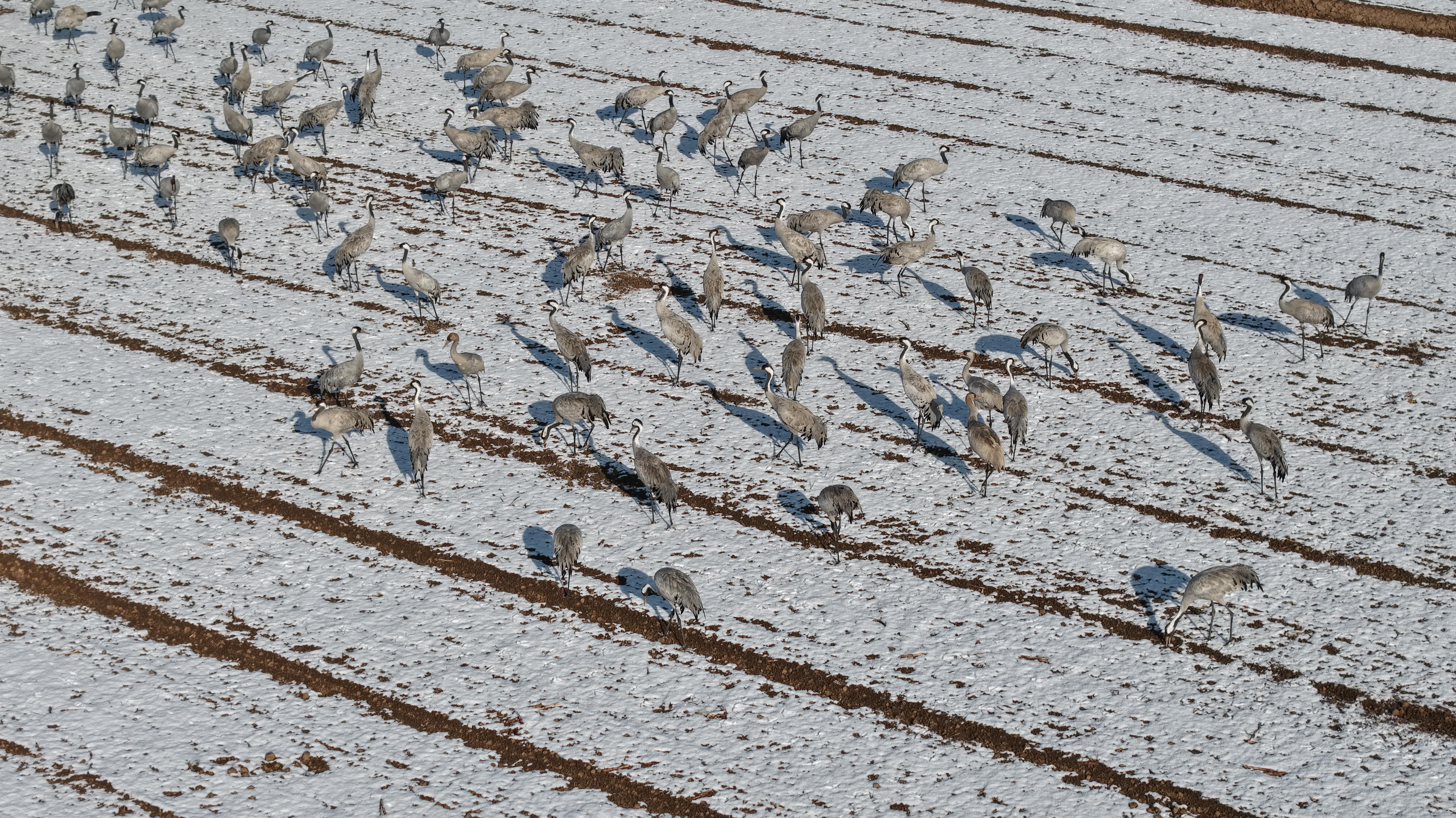 12月13日清晨,湖畔麦田中有一群灰鹤亭亭玉立。它们身着标志性的灰色羽毛,在白雪皑皑的田地间格外醒目,黑白相间的色彩对比勾勒出别样的冬日图景。这些“冬日来客”在田间时而展开宽大翅膀展翅高飞,身姿矫健地掠过雪地与湖面;时而俯身麦田觅食,专注探寻食物;时而两两相依、交颈私语,尽显亲昵姿态,每一个动作都饱含自然意趣。