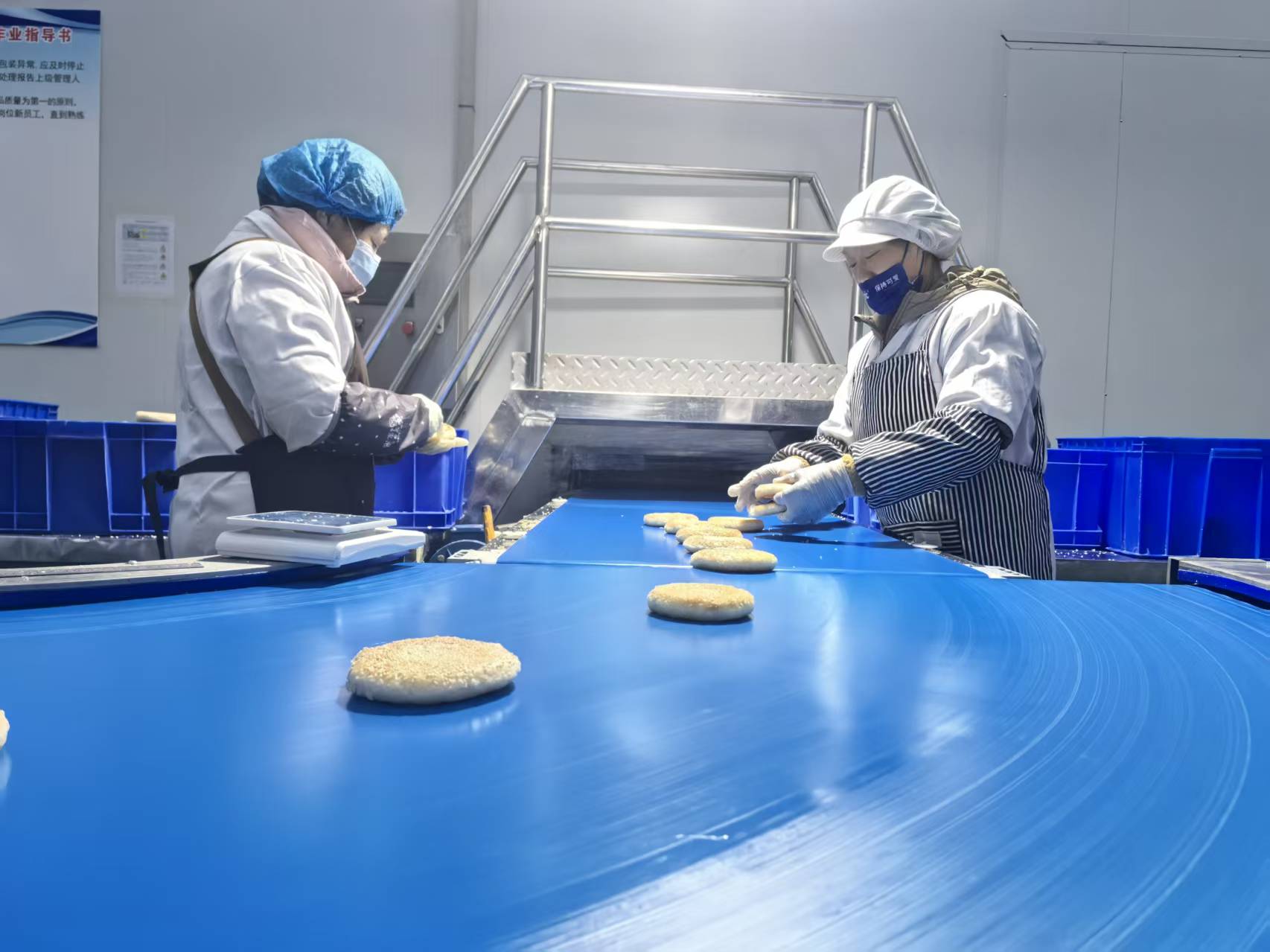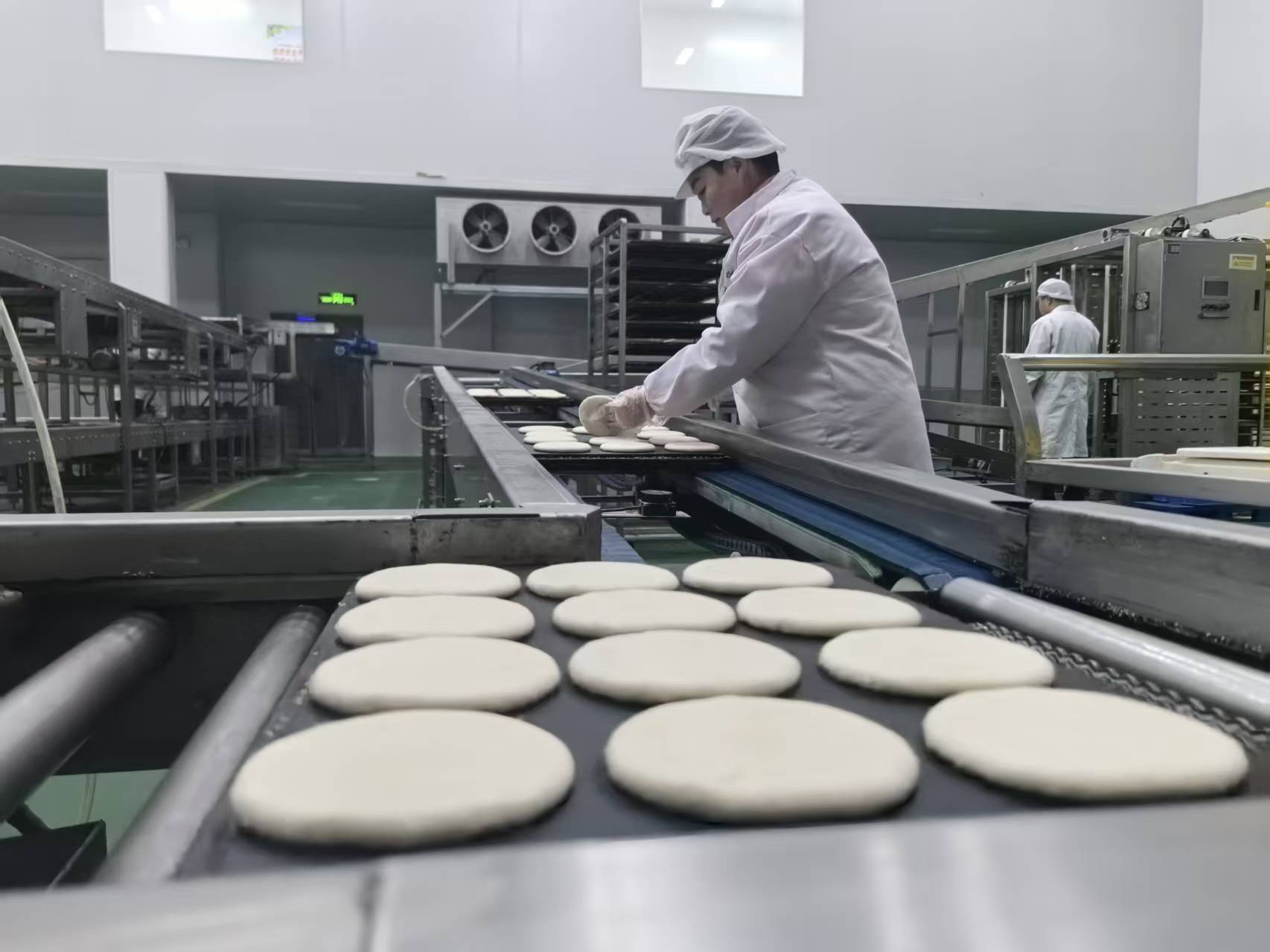 与室外的喧腾不同,一期厂房内则是另一番光景:在整洁明亮的车间里,全自动烧饼生产线正开足马力运转,从和面、醒面、制饼到烘烤、包装,整个流程一气呵成,金黄酥脆的烧饼鱼贯而出,香气四溢。