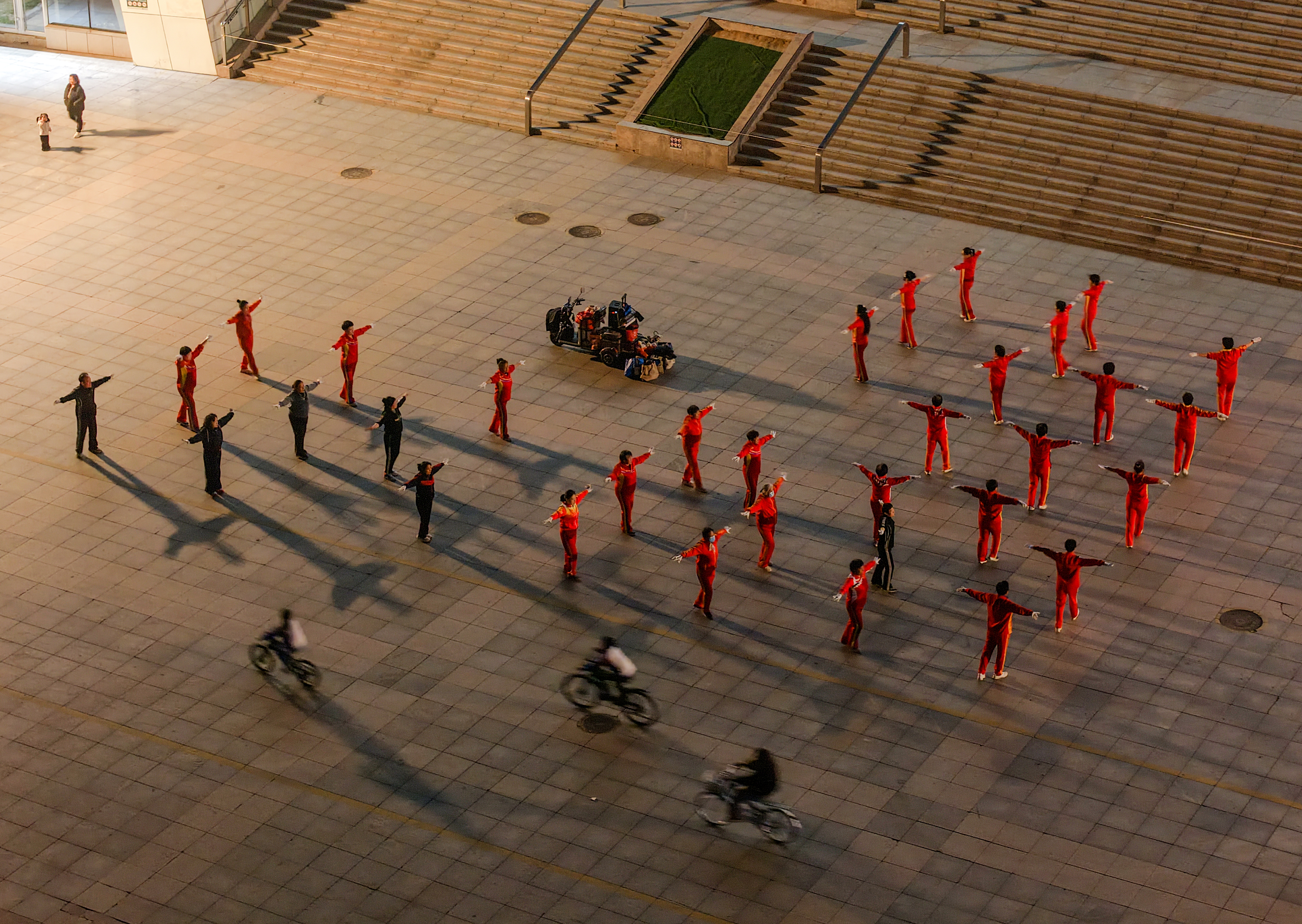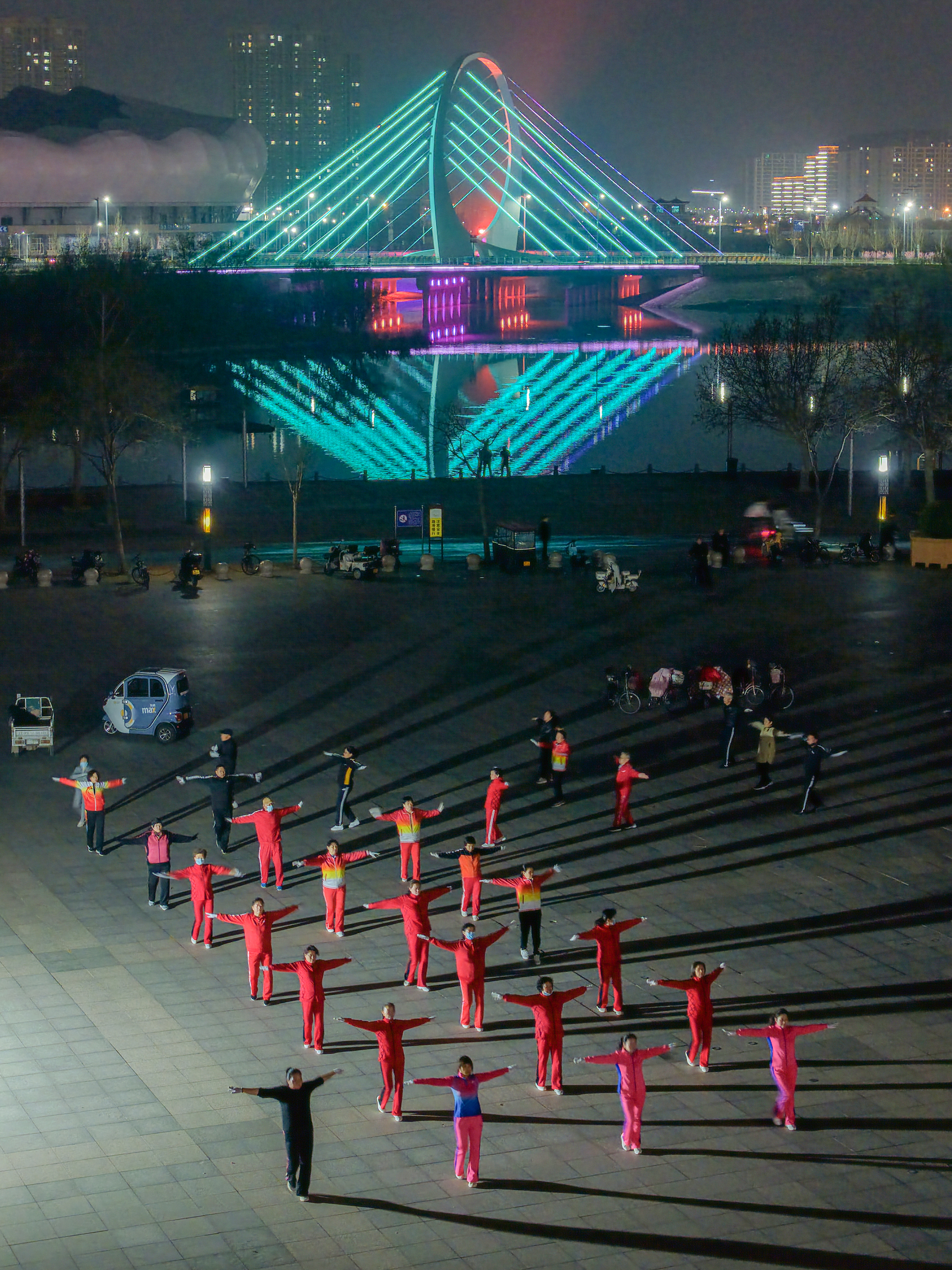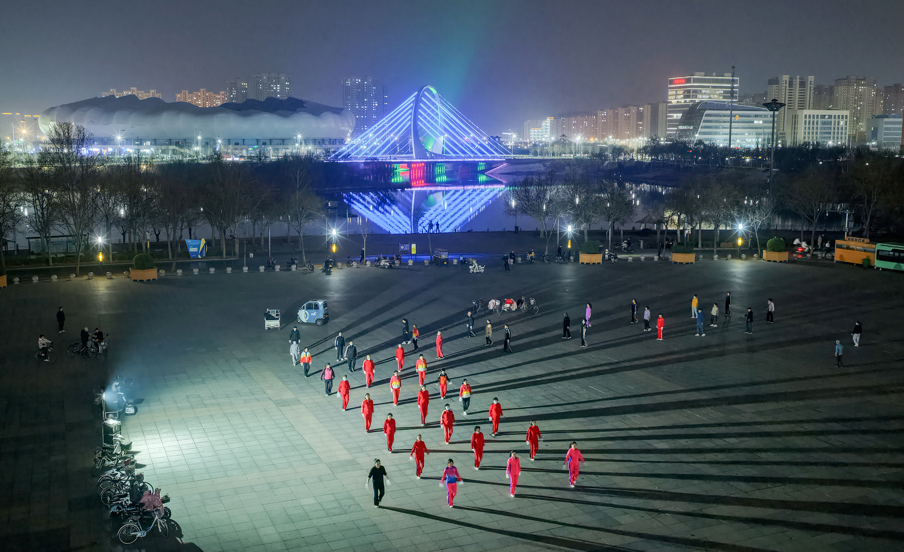 从晨光熹微到夜色降临,不同年龄段的健身爱好者齐聚一堂,整齐的动作、昂扬的精神,勾勒出城市全民健身的生动图景。