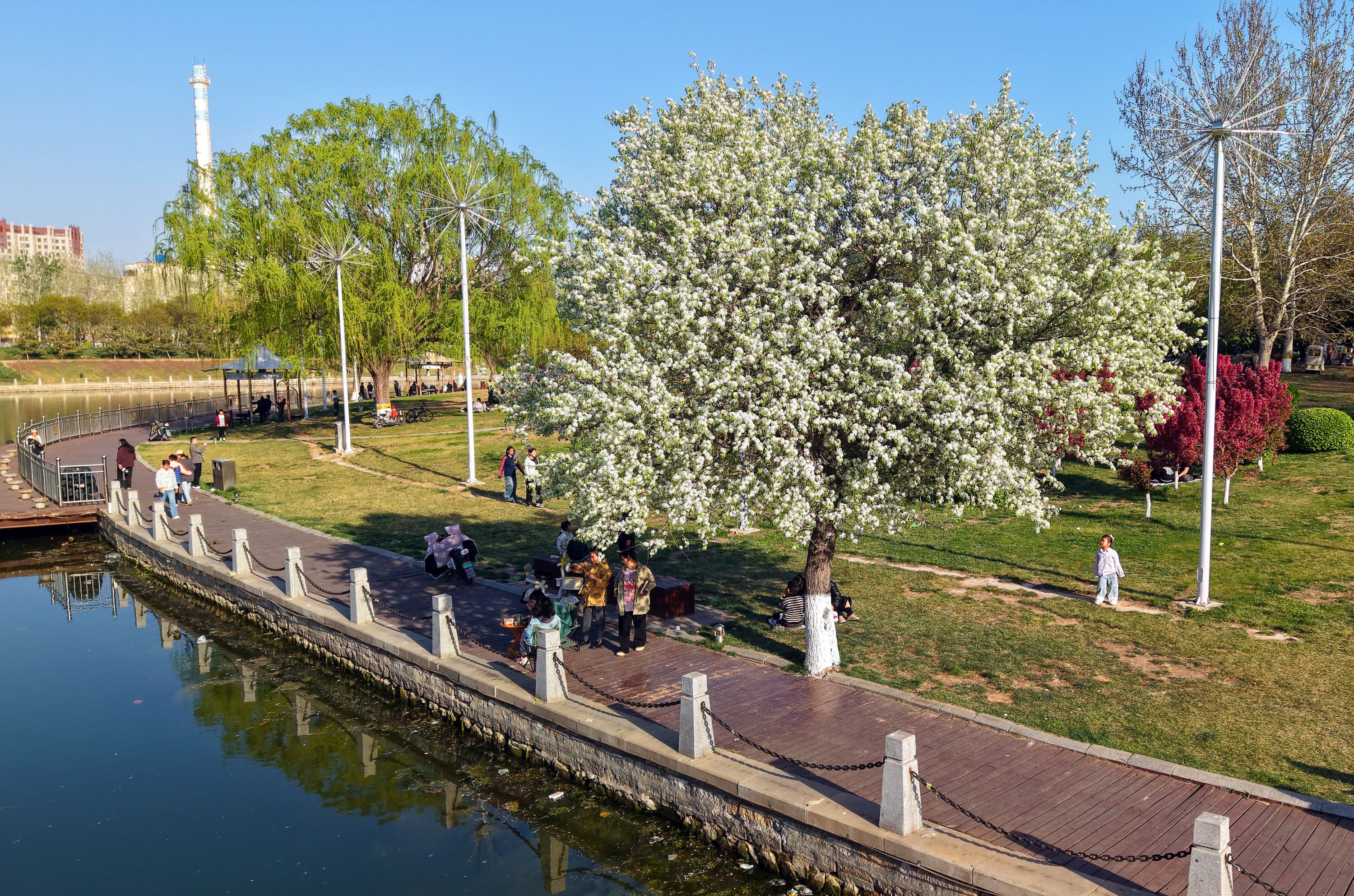 4月4日,在滏阳河衡水市区段,沿育才大街以西路段向滏阳河南岸望去,河坡之上林木错落、品类繁多,唯独这株杜梨树“独树一帜”,身姿挺拔、气质清雅,远离其他林木,独自矗立在距河边不远的地方。其对面便是热闹喧嚣的萧何文化广场,静谧的古树与热闹的广场一静一动、相映成趣,构成了一幅独特的城市春日图景。